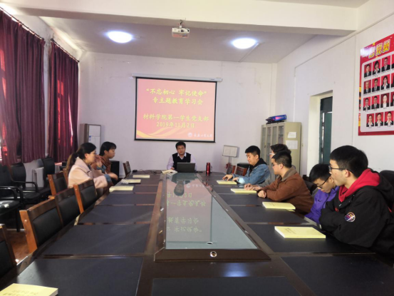 学生第一党支部在材料楼五楼党建活动室召开““不忘初心,牢记使命”主题教育学习会,学生第一党支部全体党员参加了会议,学生党支部书记万杨主持会议。