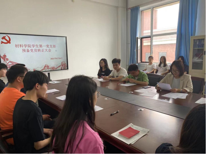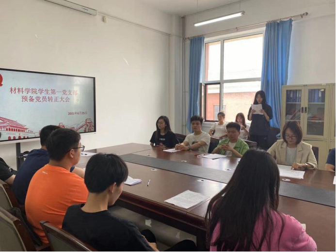 学生第一党支部于材料楼425会议室召开转正大会。本次大会由党支部书记李爽主持,对颜榕等7名同志是否能如期转正进行讨论和表决。