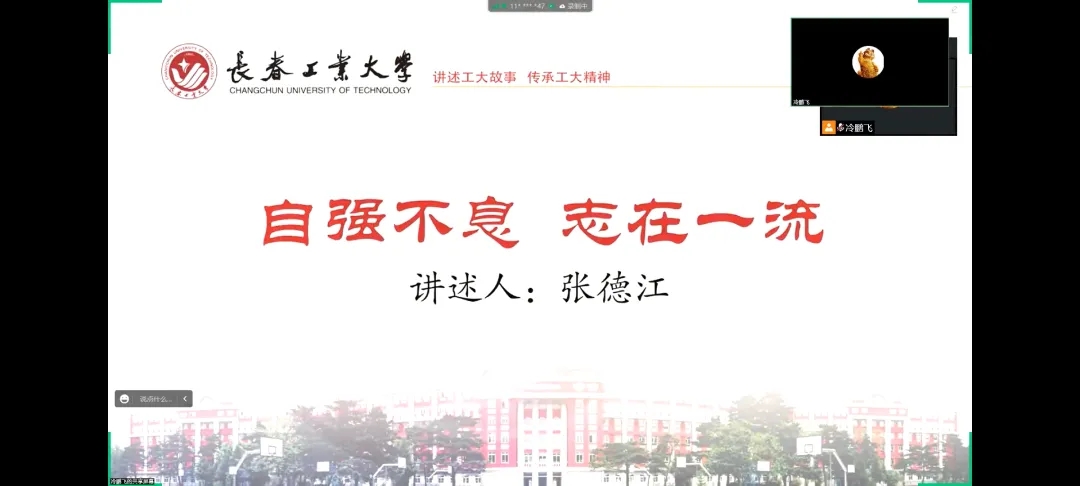 原长春工业大学校长张德江讲述的《自强不息 志在一流》分别从党建思想政治工作,教育教学评估工作,申报博士点,学生赛事等各方面讲述了工大师生自强不息,争创一流的精神。