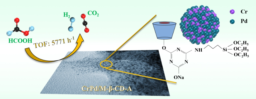 针对以上问题,此项工作通过简易的湿化学法设计并制备了3-氨丙基三乙氧基硅烷功能化环糊精(M-β-CD-A)担载CrPd纳米颗粒,并将其应用于催化甲酸分解制氢反应中。得益于CrPd纳米颗粒与M-β-CD-A衬底之间界面(金属/有机界面)的强相互作用,Cr0.4Pd0.6/M-β-CD-A在催化甲酸分解制氢反应中表现出优异的活性和100%的氢气选择性,反应在不含任何添加剂的条件下,323 K下的初始转化频率(TOF)高达5771 mol H2 mol Pd-1 h-1,明显高于大多数类似反应条件下的异相催化剂。经进一步研究发现,金属/有机界面的相互作用可以有效调控金属纳米颗粒的电子结构,粒径尺寸和颗粒分散,进而优化其催化性能。此外,Cr的引入不仅能够通过协同效应改善Pd的电子结构从而提高催化剂的活性,而且能够降低催化剂的成本。