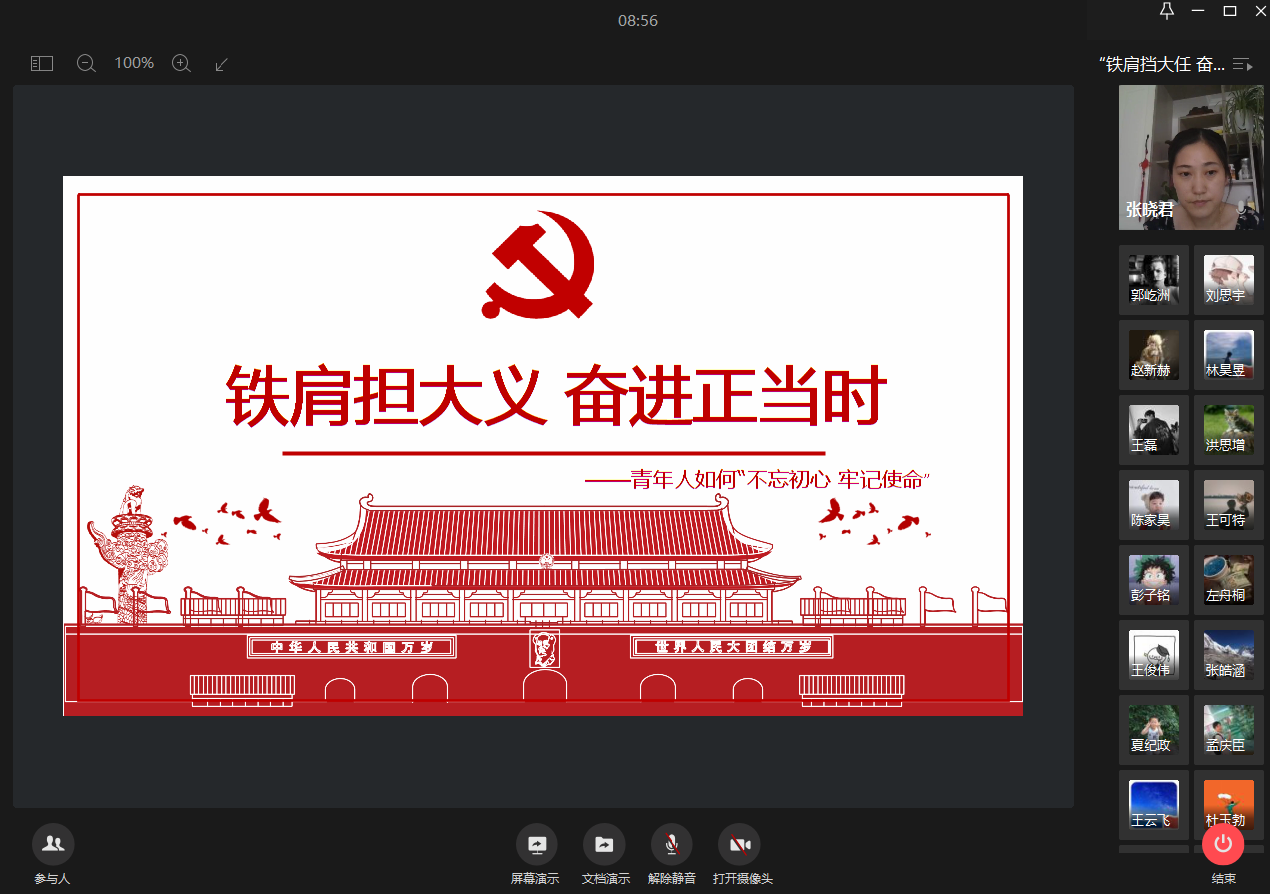 张晓君老师就青年人如何“不忘初心,牢记使命”进行论述,以“铁肩担大义,奋进正当时”为主题开展党课培训。