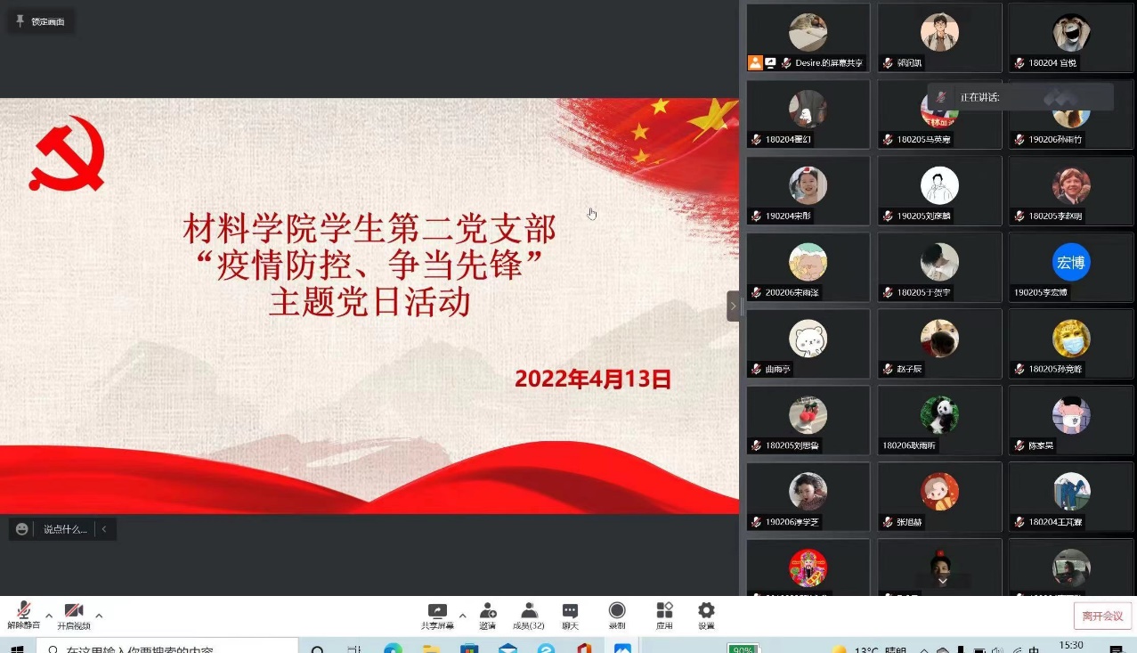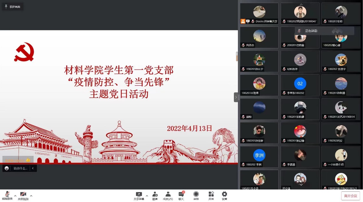 学生第一党支部、学生第二党支部于2022年4月15日在线上开展“疫情防控,争当先锋”主题党日活动。学生第一、二党支部全体党员参加本次活动。