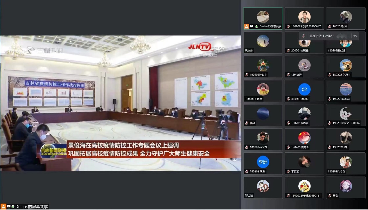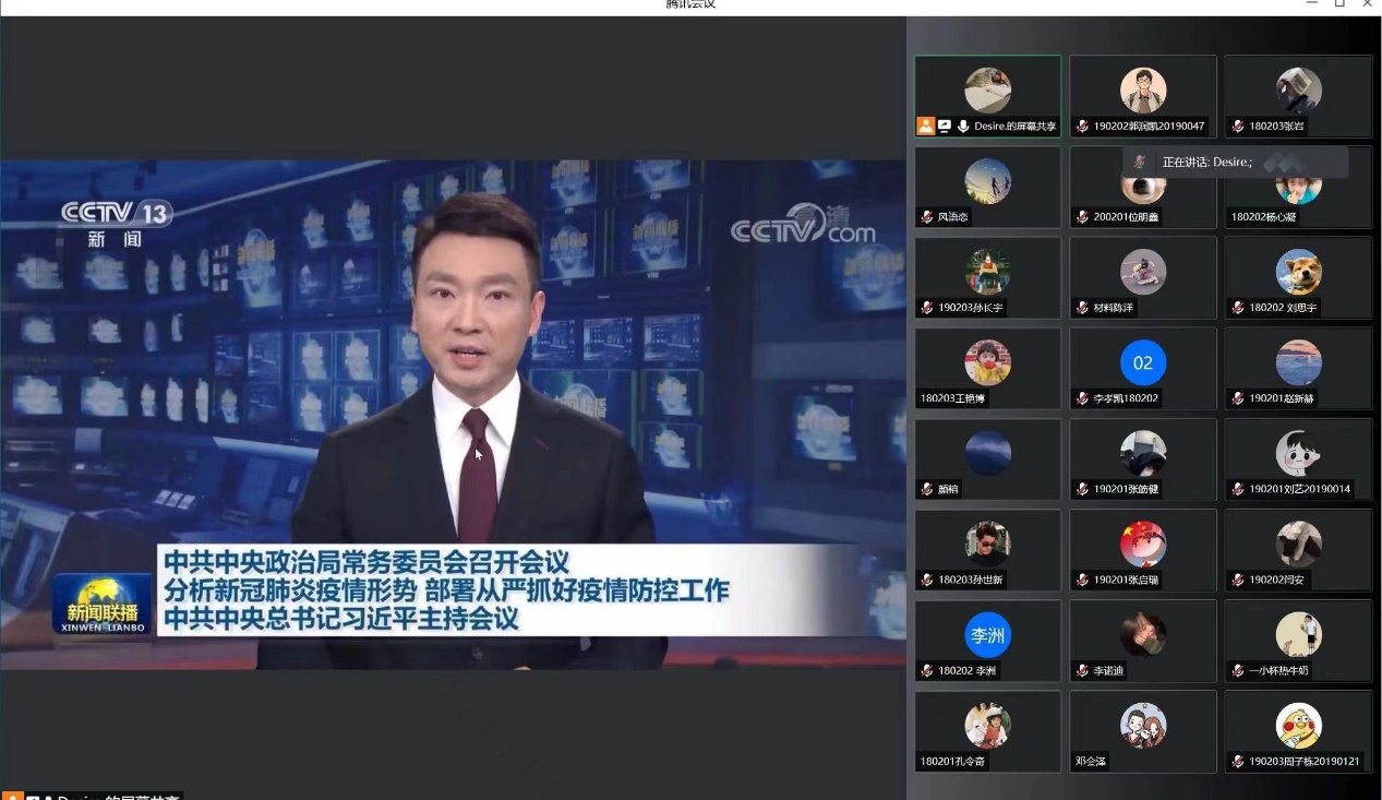 学生第一、第二党支部全体党员共同观看了中共中央政治局常务委员会召开,中共中央总书记习近平主持的会议,此次会议分析了新冠肺炎疫情形势部署,要从严抓好疫情防控工作。