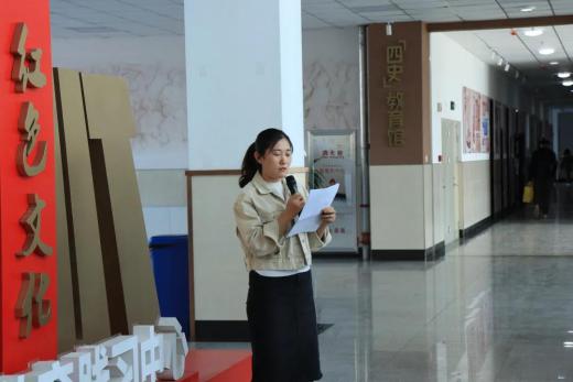 学生代表吕梓源代表学生发出倡议,作为青年大学生,我们要不断学习党的光辉历史,从自我做起,从每一天做起,一步一个脚印,一步一个台阶,以锐意进取、永不懈怠的精神状态,向着实现中华民族伟大复兴的中国梦奋勇前行。