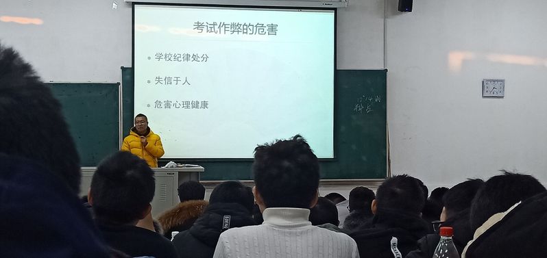 在学风建设方面,吴书记强调,考试不中是考得知识,更考的是一个人的品质。诚信考试,是我们大学生必须具备的品质之一,我们要自觉遵守学校的考规考纪,在考试中作弊就是触犯了法律法规,这样不仅会受到学校的处分还会受到法律的制裁,吴书记还讲述考试作弊还会危害自身心理健康,使道德与知识发生背离,尤其在作弊被发现后会伤害考生自尊心,在心里设下长久阴影,影响极大。另外每位学生干部都应力所能及地对身边的同学进行“诚信考试”的教育和引导,及时劝诫或制止考试作弊行为的发生,以实际行动为诚信校园的建设做出一份贡献。吴书记在会上还提及了人身安全方面的内容,让同学们保护好自身安全及寒假出行安全,生命诚可贵。