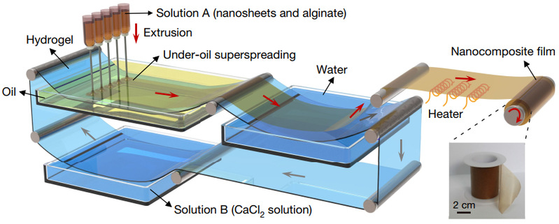 这些纳米复合膜的力学性能远远高于传统方法制备的层状结构复合膜(图3)。重要的是,通过将单一液滴超铺展扩展为多通道的连续超铺展,研究人员设计了一套能实现层状结构纳米复合膜大规模连续制备的装置。通过对成膜过程中关键参数的优化,实现了厚度均匀的层状结构纳米复合膜的连续大规模制备(图4)。另外,该方法具有优异的普适性,能实现多种纳米片的取向排列,实现多种高分子聚合体系的层状纳米复合膜的大规模连续制备。
